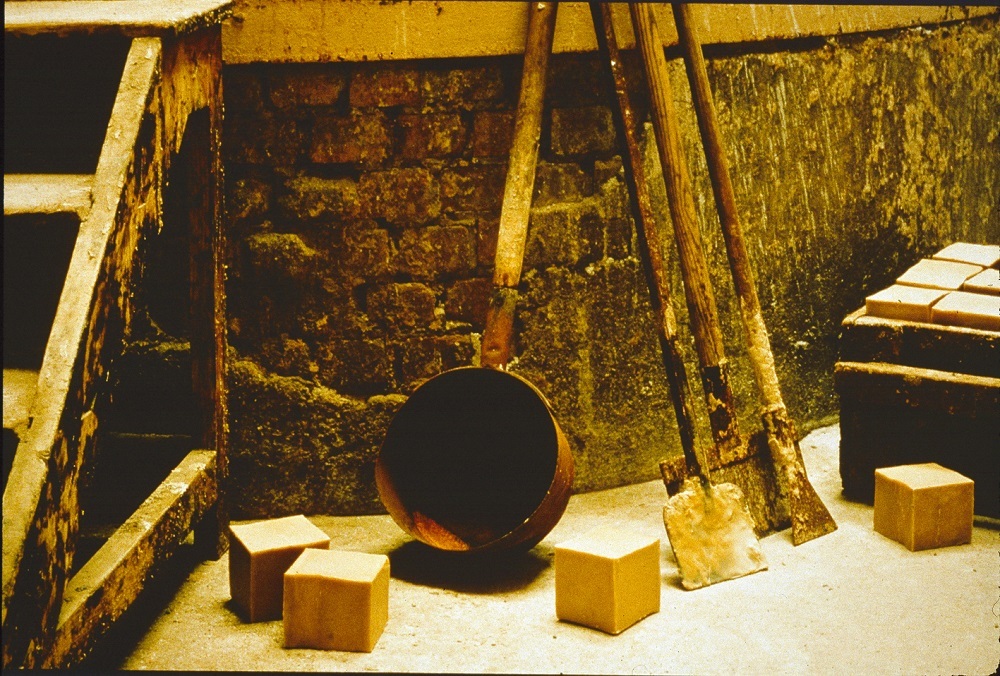 STEP4 風乾:此時將仍保持50-70度餘溫的皂糊,透過木製的導管倒流至皂田內,皂糊將在此靜置48小時,等代風乾熟成。