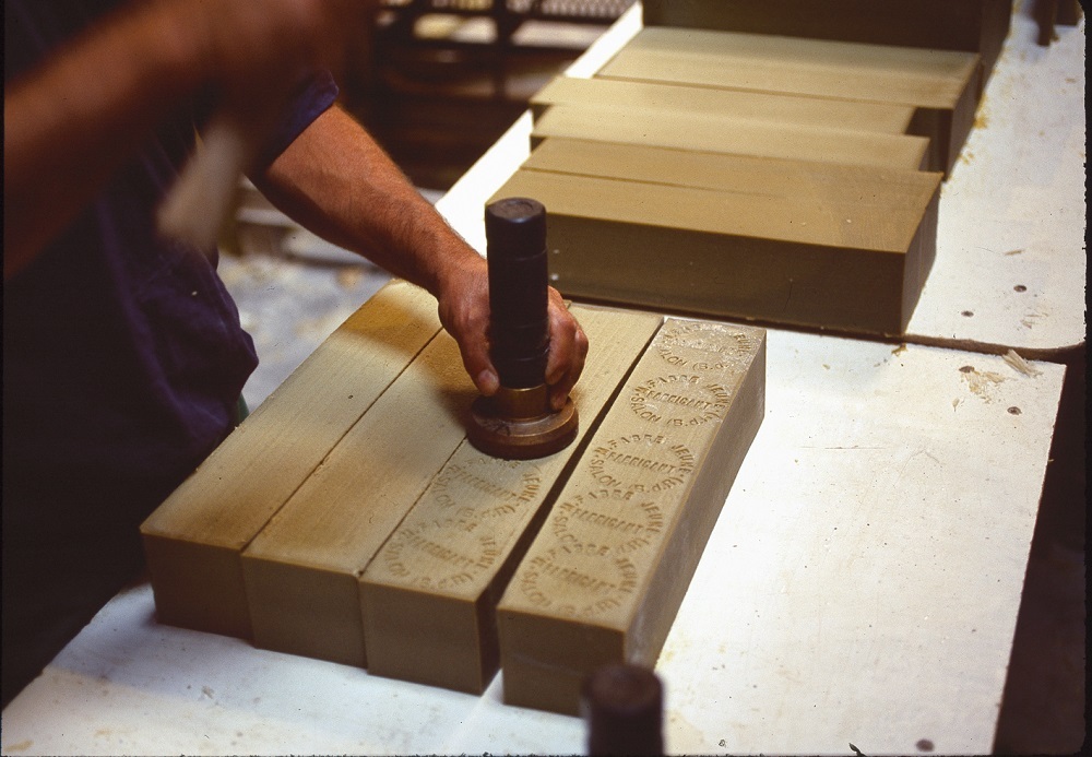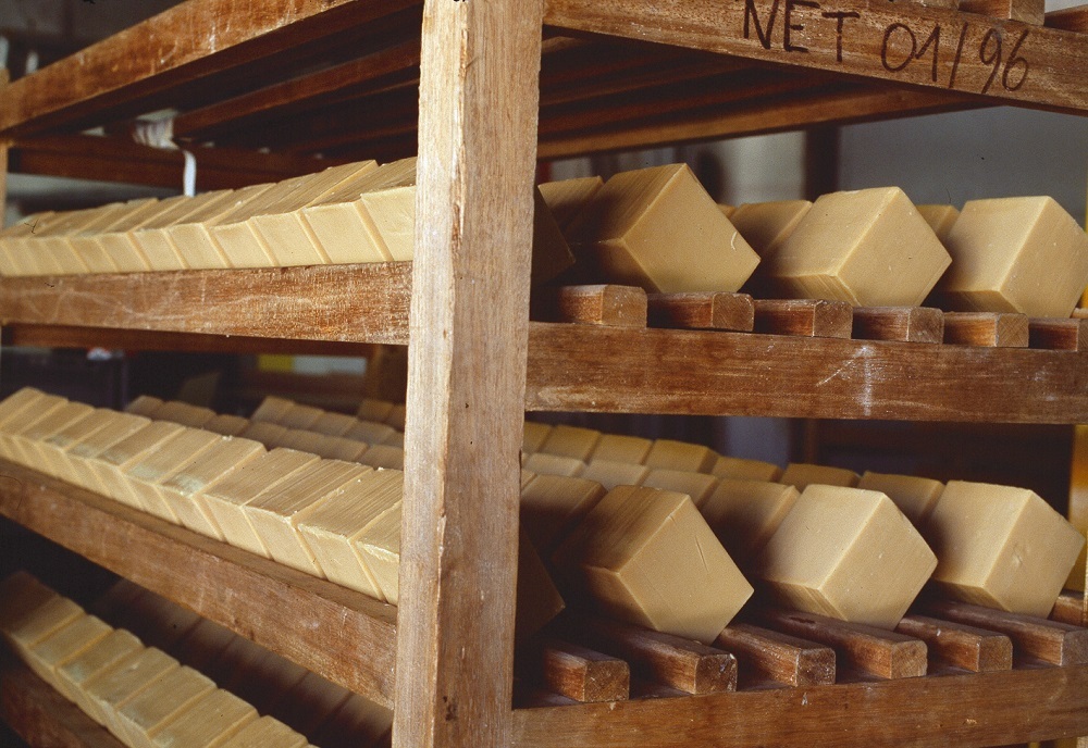 當肥皂最後熟成後,會先切成大塊的皂磚,最後再切成各種尺寸的皂磚並打上鋼印。