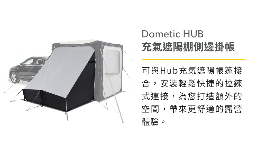 調整HUB,滿足您的多元需求。為基礎帳篷添加各種配件、網紗模組、側壁模組以及連接過道,輕鬆連接至旅行車、SUV 和露營車。單點充氣AIR Frame 技術和快搭拉扣確保您能快速固定帳篷,立即享受戶外時光。