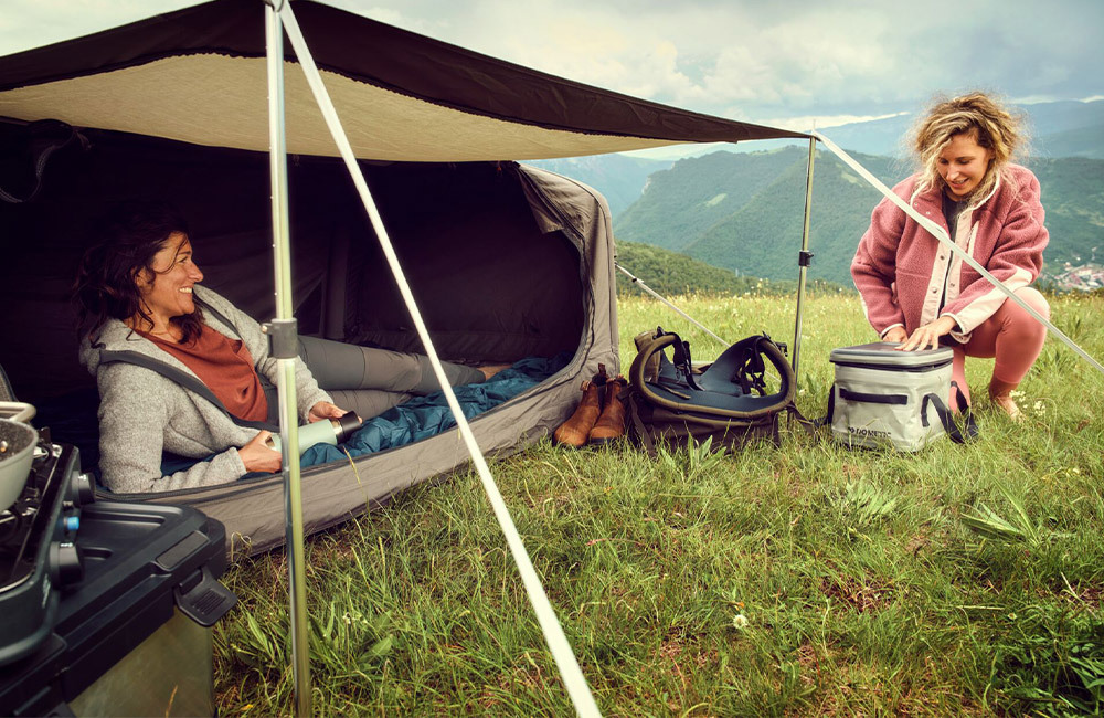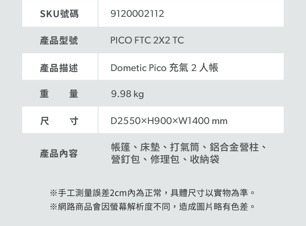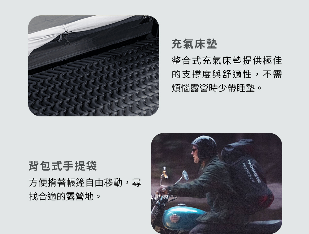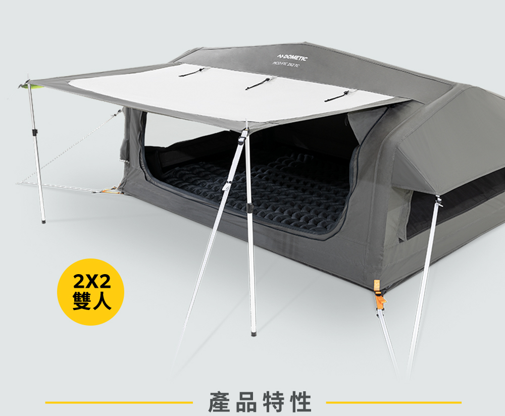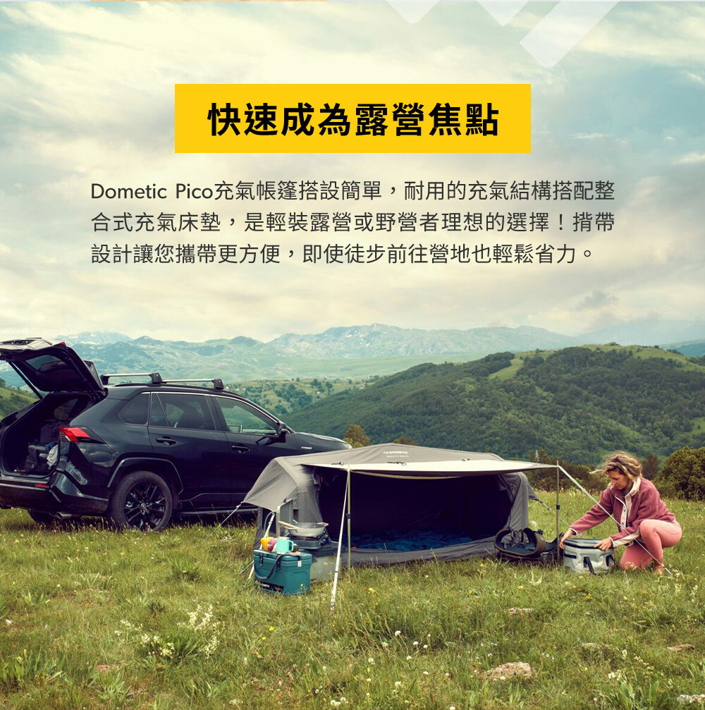 帶著 Dometic Pico FTC 雙人氣柱帳篷。Dometic Pico 配有整合式充氣床墊和耐用的充氣框架,是情侶和單人露營者理想的一體化彈出式帳篷。方便的手提包配有背包帶,方便短距離和長距離步行運輸。先進的滌棉材料可減少冷凝,確保您在 2 人帳篷的露營旅行中保持舒適和乾燥。