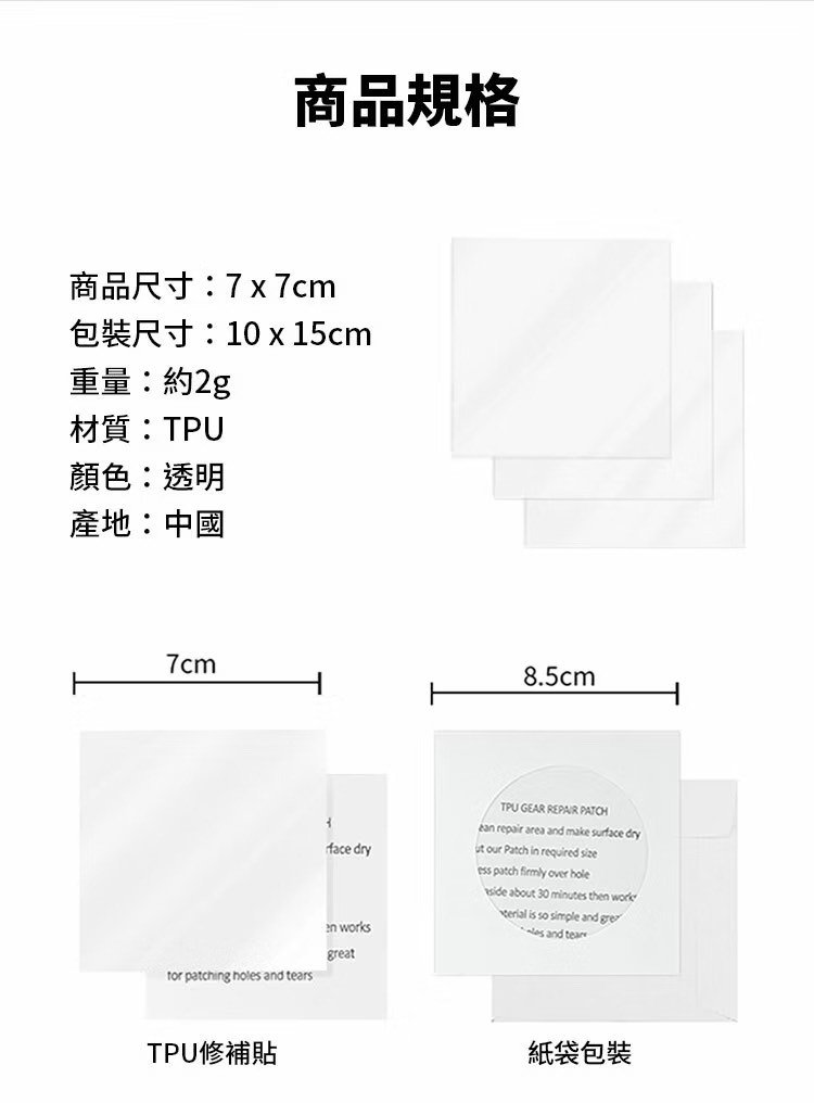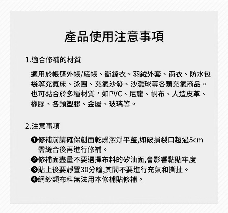 適用於帳篷/睡袋/睡墊/充氣枕/防水袋等修補