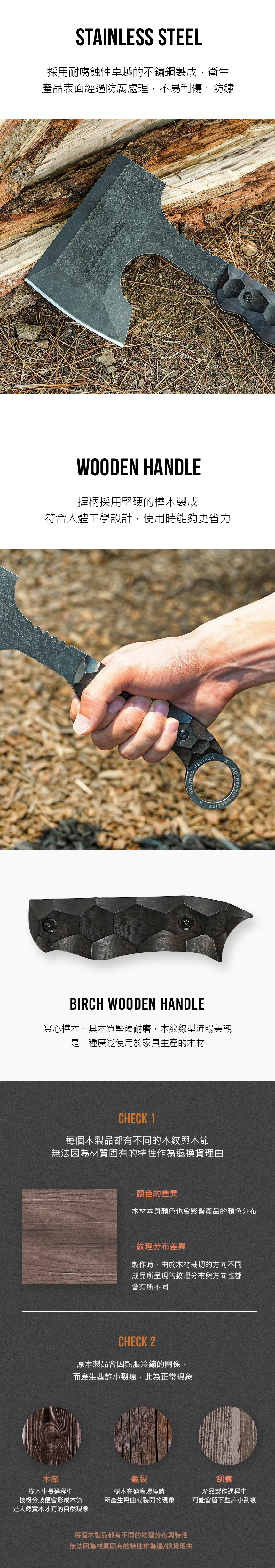 材質:刀刃:不鏽鋼/握柄:樺木/保護套:人造皮革
