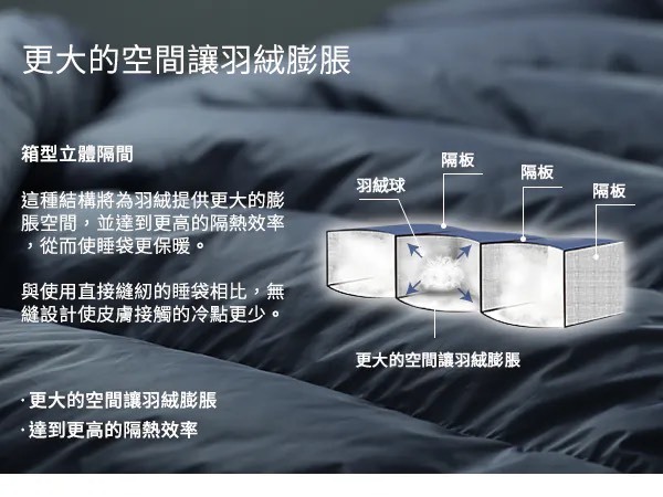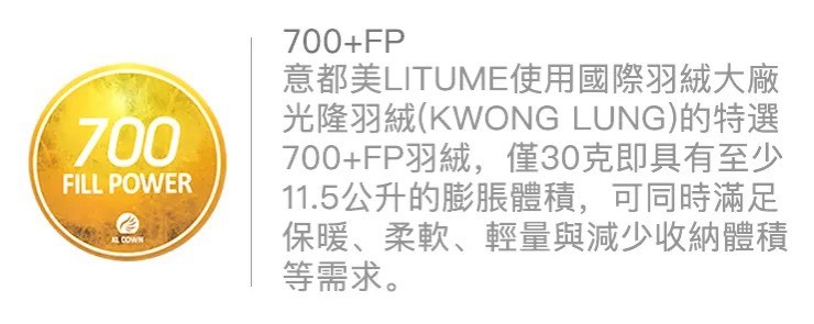 羽絨規格:700+FP (90/10 JIS) ≈ 750+ FP (EN 90/10)