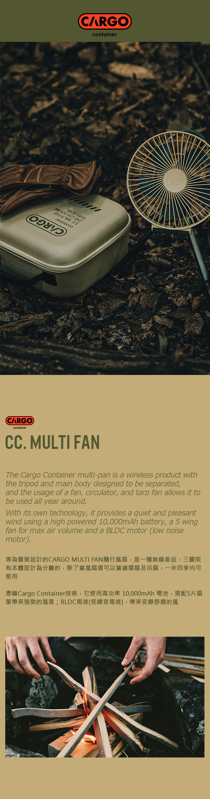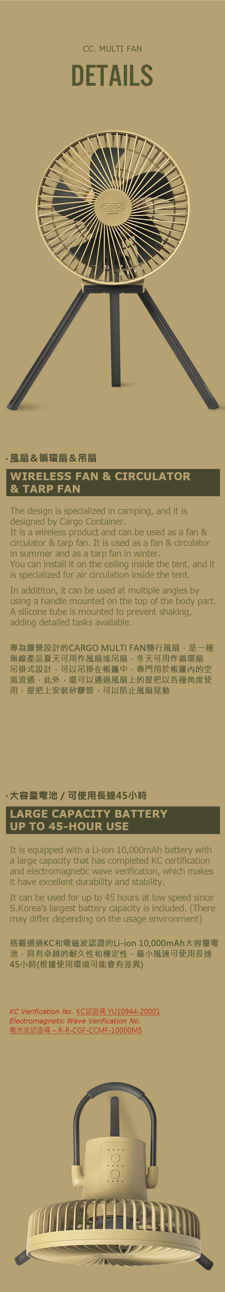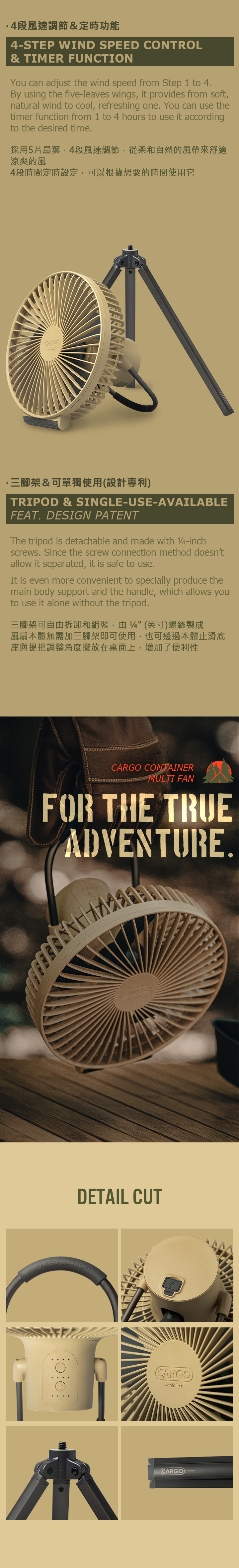 野營專用設計,三腳架和主體設計為分離的,是一種無線產品,可以全年使用。 憑藉Cargo Container技術,它使用高功率 10,000mAh 電池、最大風量的 5 翼風扇和 BLDC 馬達(低噪音馬達)提供安靜宜人的風。