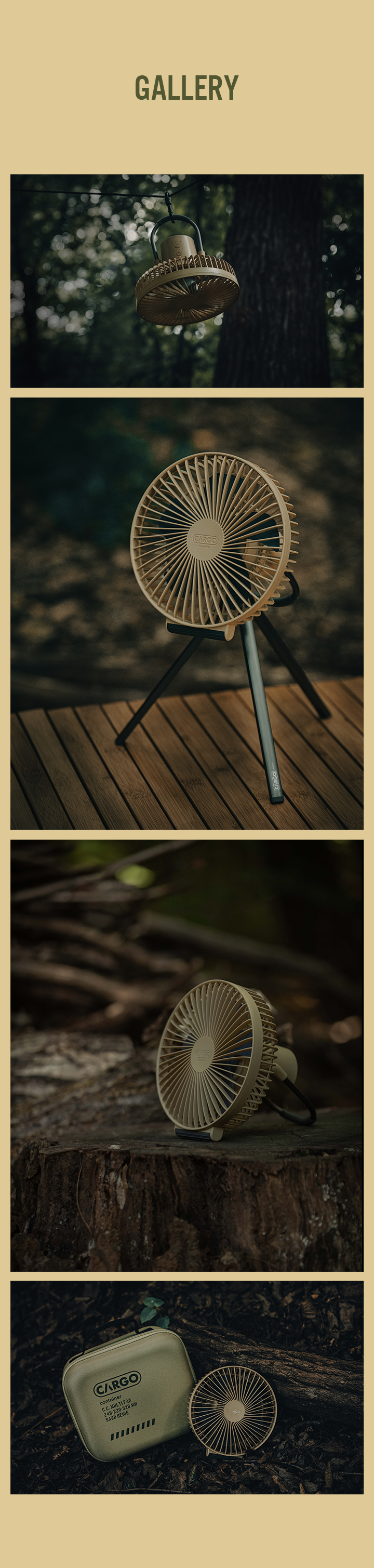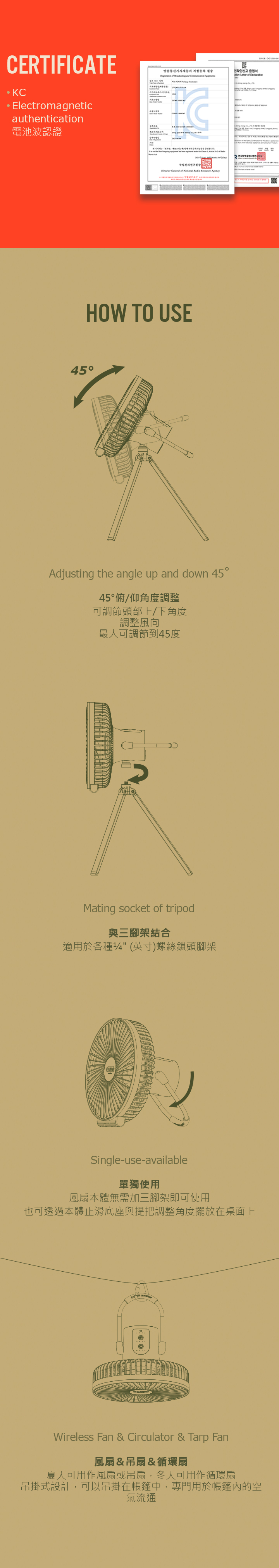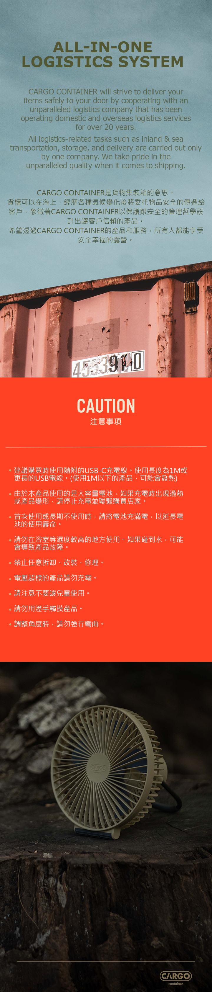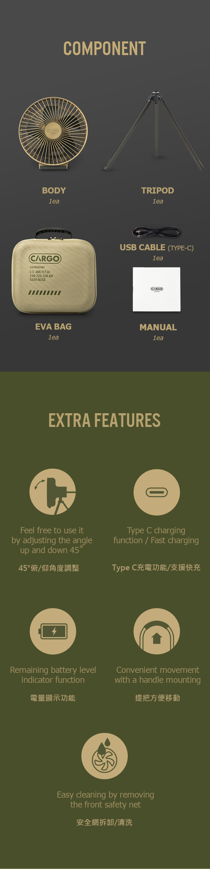野營專用設計,三腳架和主體設計為分離的,是一種無線產品,可以全年使用。 憑藉Cargo Container技術,它使用高功率 10,000mAh 電池、最大風量的 5 翼風扇和 BLDC 馬達(低噪音馬達)提供安靜宜人的風。